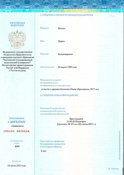2023 г. – Ростовский государственный медицинский университет (Педиатрия).