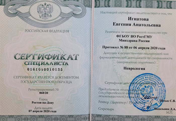 •  2020 г. – Повышение квалификации: ФГБОУ ВО Ростовский государственный медицинский университет (Неврология).