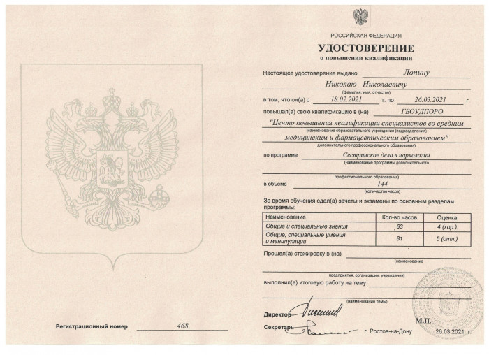 2021 г. «Сестринское дело в наркологии». Центр повышения квалификации специалистов со средним медицинским и фармацевтическим образованием